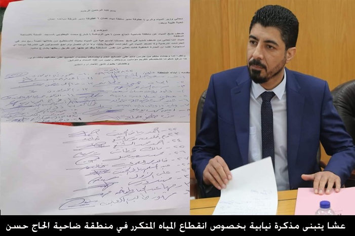 النائب احمد عشا يتبنى مذكرة بخصوص انقطاع المياه المتكرر في منطقة ضاحية الحاج حسن والمناطق المجاورة .