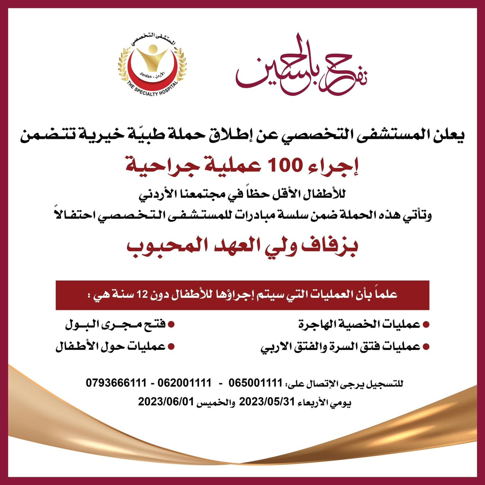 لاننا نعلم بأن صاحب السمو ولي العهد يفرح بالمبادرات التي تخدم مجتمعنا الأردنييسعدنا الاعلان عن حملة طبية يقيمها المستشفى التخصصي…