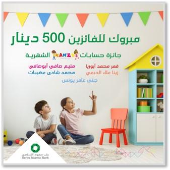 هرمنا – في إطار مواصلة عمليات السحب على جوائز حساب توفير الأطفال “كنزي”، كشف بنك صفوة الإسلامي عن أسماء الفائزين الخمسة لشهر شباط 2022، والذين أضيف لرصيد كل منهم مبلغاً نقدياً قدره 500 دينار أردني.