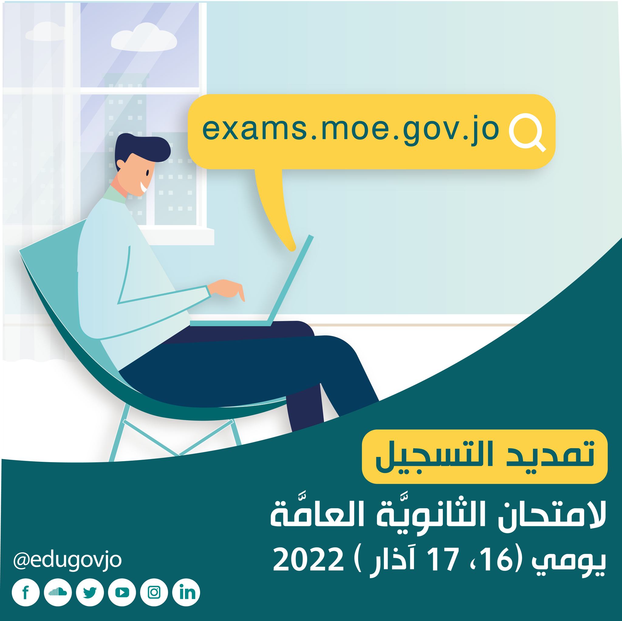 هرمنا – نشرت وزارة التربية والتعليم وعبر صفحتها عالفيس لطلبة التوجيهي الأعزاء،تقرر تمديد التسجيل في الامتحان العام لعام 2022 لمن لم يتمكنوا من التسجيل في الموعد المحدد،..بدءًا من صباح يوم غد الاربعاء (16) آذار، وحتى مساء بعد غد الخميس الموافق (17) آذار 2022.