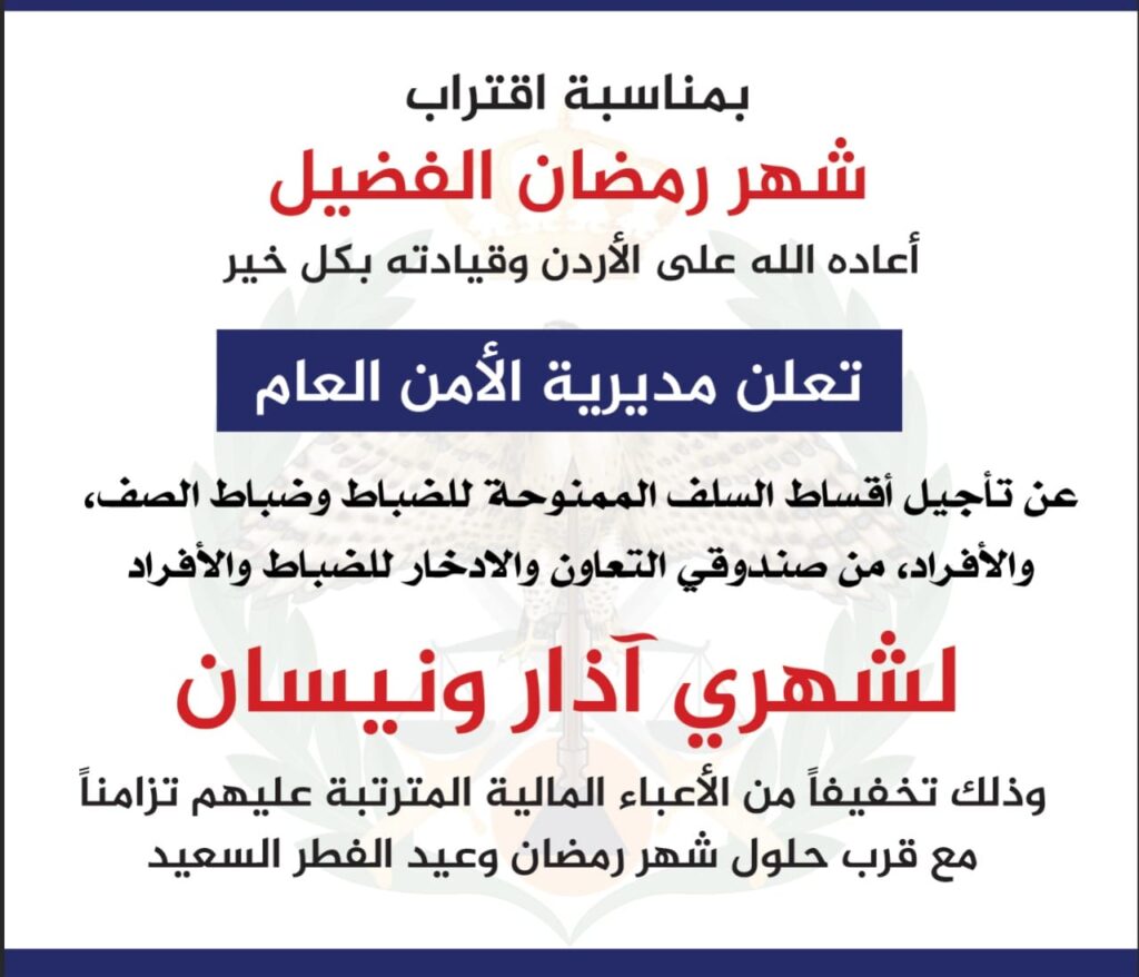 هرمنا – اعلنت مديرية الامن العام وعبر صفحتها عالفيس عن تأجيل أقساط السلف الشخصية للمرتبات لشهري اذار ونيسان
