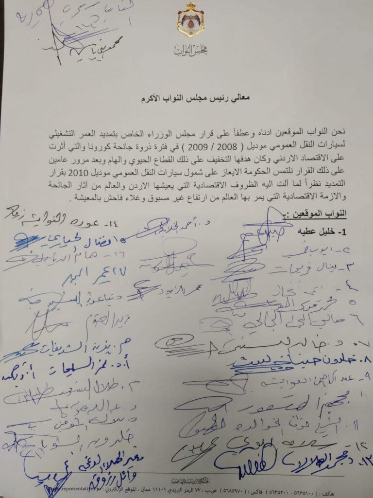 نحن النواب الموقعين أدناه وعطفاً على قرار مجلس الوزراء الخاص بتمديد العمر التشغيلي لسيارات النقل العمومي موديل ( 2008 / 2009 ) في فترة ذروة جائحة كورونا والتي أثرت على الاقتصاد الأردني وكان هدفها التخفيف على ذلك القطاع الحيوي والهام وبعد مرور عامين على ذلك القرار نلتمس الحكومة الإيعاز على شمول سيارات النقل العمومي موديل 2010 بقرار التمديد نظراً لما آلت اليه الظروف الاقتصادية التي يعيشها الأردن والعالم من آثار الجائحة والأزمة الاقتصادية التي يمر بها العالم من ارتفاع غير مسبوق وغلاء فاحش بالمعيشة .