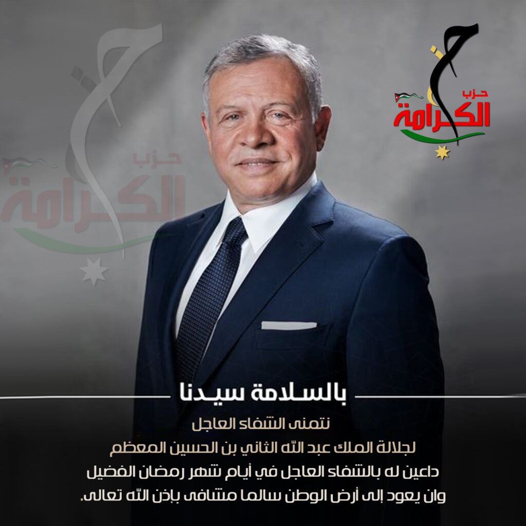 ” ونحن نتابع بقلوب وعقول تغمرها مشاعر الولاء والانتماء والمحبة الغامرة سفر جلالة الملك عبدالله الثاني إلى ألمانيا لتلقي العلاج، نتضرع إلى الله العلي العظيم الشافي المعافي أن يمن على سيد البلاد وفارس العطاء والبناء والإنجاز الوطني بالشفاء العاجل والعودة من رحلته العلاجية سالما غانما معافا متمتعا بموفور الصحة والعافية، ليستكمل مسيرة البناء والعطاء والريادة، وقيادة الأردن العزيز نحو التقدم والازدهار.