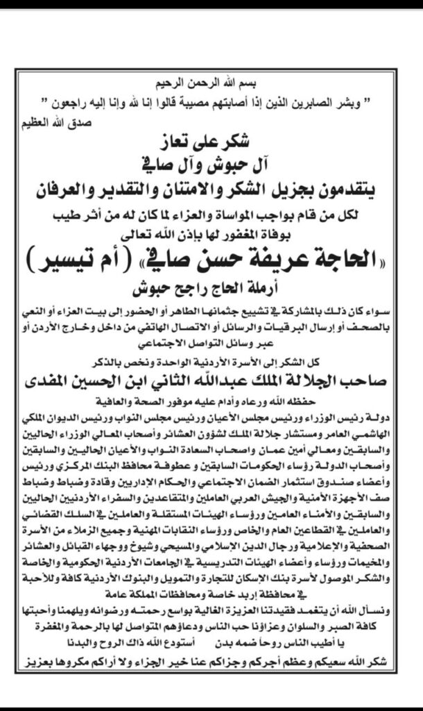 هرمنا – يتقدم الزميل ماهر حبوش / المدير تنفذي لاادارة العلاقات العامة والاعلام في بنك الاسكان. وكل آل حبوش وآل صافي بالشكر على تعازي بوفاة المرحومة