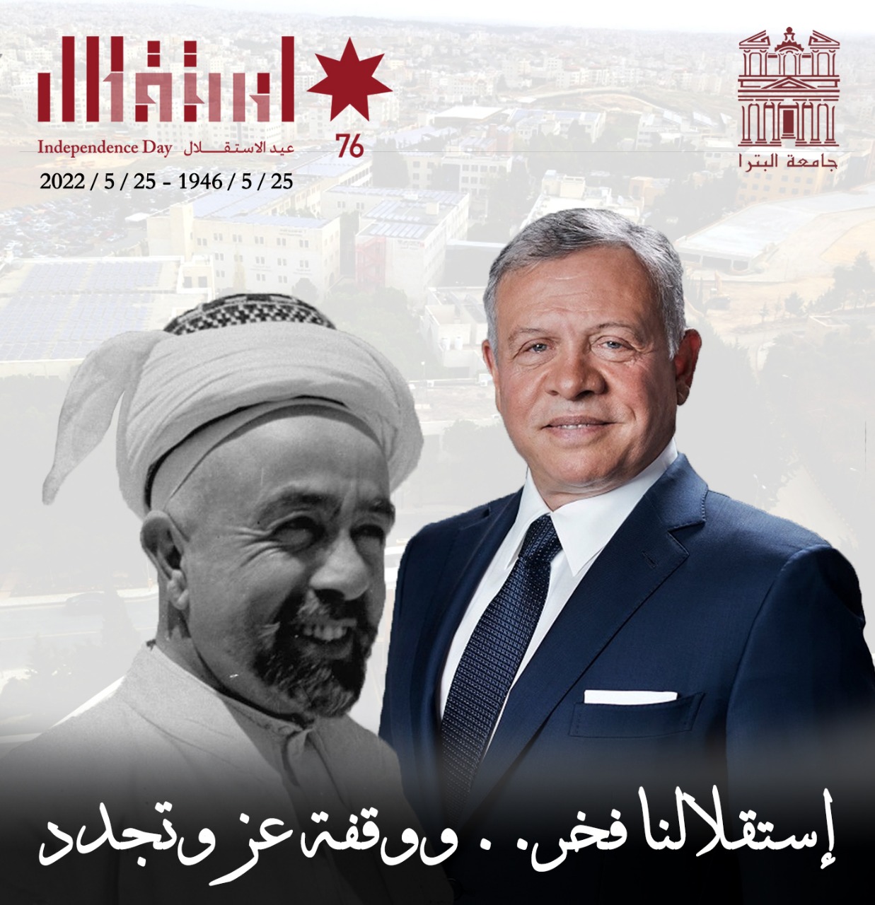 وذلك برعاية رئيس الجامعة الدكتور مروان المولا؛ ووسط حضور عربي واسع ورفيع. وتخلل الحفل فقرات متنوعة عرضت لتاريخ الأردن ومفاخره الوطنية وتراثه الخالد، وأستذكرت مآثر الإستقلال الذي قام عليه بناء الأردن الحديث؛ تحت مظلة القيادة الهاشمية التي أنجزت هذا الإستقلال عام 1946م ليكون باكورة منجزات الثورة العربية الكبرى، وإرثها الخالد الذي صانه الأردنيون بأرواحهم ودمائهم. ورافقت فقرات الحفل المتنوعة؛ الأهازيج والأغنيات الوطنية التي صدح بها الفنان سعد أبو تايه وفرقته التراثية. كما تخلله معزوفات لفرقة موسيقات الأمن العام، وعروض فروسية لمنتسبي جهاز الأمن العام، وفقرات غنائية لطلبة الجامعة. في حين حرص رئيس الجامعة على تكريم العديد من المشاركين والقائمين على إنجاز هذا العرس الوطني، وبعض وجهاء المجتمع المحلي وكان الدكتور مروان المولا استعرض أمام الحضور الكريم؛ قيمة الإستقلال ومنجزاته التي ينعم بها الأردنيون اليوم: مباهياً :” حقٌ لنا أن نحتفي بهذه المناسبة، وأن نفخر بها، وبقيادتنا الهاشمية، التي أخذت عهدأ على نفسها أن يكون الإستقلال بناءً وإنجازاً وإضافة مستمرة، حتى استوى صرح نهضتنا على هذا النحو الشامخ، شموخ نفوسنا وأرواحنا التي تشكلت في ظل الراية الهاشمية الخفاقة”. في حين شدد عميد شؤون الطلبة الدكتور فتحي الفاعوري على أن” الإستقلال الذي نختفي به سطر أمجاده الهاشميين عبر سني المملكة الأردنية الهاشمية”. لافتاً إلى أن” فترة تعزيز بناء هذا الوطن العزيز تزامنت وتسلم الملك عبدالله الثاني قيادة الأردن؛ حيث عزز جلالته المجالات الإفتصادية، والإجتماعية، والثقافية، والسياسية والأمنية حتى غدا الأردن واحة أمن وإستقرار”. في الأثناء؛ شهد الحفل حضور العديد من السفراء والدبلوماسيين العرب، من بينهم سعادة سفير سلطنة عُمان الشيخ هلال بن مرهون المعمري، والملحق الثقافي السعودي الدكتور عيسى بن فهد الرميح، والملحق الثقافي العراقي الدكتور وسيم التميمي، والمستشار الثقافي لمملكة البحرين ندى جاسم الحربان، والملحق الثقافي للجمهورية الجزائرية أسماء لبيض، والملحق الثقافي لسلطنة عُمان السيد خميس بن علي السندي، ونائب الملحق الثقافي الفلسطيني عبير المراغي. وذلك إضافة لحضور واسع من قبل قيادات جهاز الأمن العام الأردني، وعدد من نواب رؤساء جامعاتٍ أردنية، وعمداء لشؤون الطلبة في صروح وطنية جامعية. وتميز إحتفال جامعة البترا بذكرى إستقلال الأردن السادس والسبعين؛ بمشاركة حشد واسع من طلبة الجامعة العرب في هذا العرس الوطني، بغية توسعة رقعة الفرح لتتخذ صبغة عربية، وذلك من خلال تخصيص أجنحة ومعارض على هامش الفعالية لعديد من الدول العربية؛ مثل اليمن والعراق وسلطنة عُمان وسوريا وفلسطين. ناهيك عن تخصيص جناح أردني لإبراز الهوية الوطنية العربية لشعب وطننا الأصيل