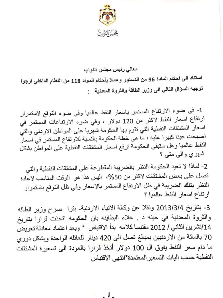 استناد الى احكام المادة 96 من الدستور وعملا بأحكام المواد 118 من النظام الداخلي ارجوا
