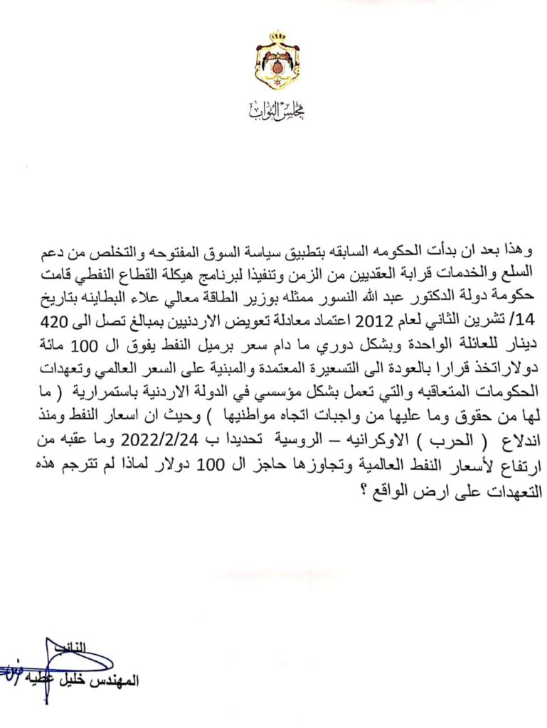وهذا بعد ان بدأت الحكومه السابقه بتطبيق سياسة السوق المفتوحه والتخلص من دعم السلع والخدمات قرابة العقديين من الزمن وتنفيذا لبرنامج هيكلة القطاع النفطي قامت حكومة دولة الدكتور عبد الله النسور ممثله بوزير الطاقة معالي علاء البطاينه بتاريخ 14/ تشرين الثاني لعام 2012 اعتماد معادلة تعويض الاردنيين بمبالغ تصل الى 420 دينار للعائلة الواحدة وبشكل دوري ما دام سعر برميل النفط يفوق ال 100 مائة دولاراتخذ قرارا بالعودة الى التسعيرة المعتمدة والمبنية على السعر العالمي وتعهدات الحكومات المتعاقبه والتي تعمل بشكل مؤسسي في الدولة الاردنية باستمرارية ( ما لها من حقوق وما عليها من واجبات اتجاه مواطنيها ) وحيث ان اسعار النفط ومنذ اندلاع ( الحرب ) الاوكرانيه – الروسية تحديدا ب 24/2/2022 وما عقبه من ارتفاع لأسعار النفط العالمية وتجاوزها حاجز ال 100 دولار لماذا لم تترجم هذه التعهدات على ارض الواقع ؟