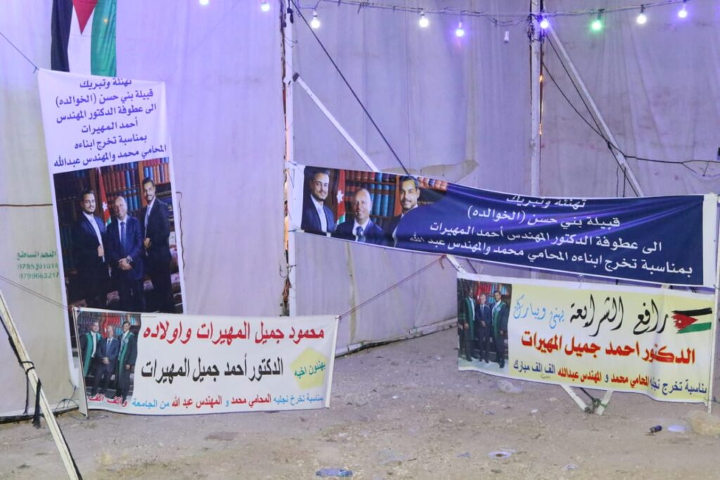 الأصالة عن نفسي، ونيابة عن عشيرتي بني عباد/ المهيرات /الفقهاء، أتقدم بجزيل الشكر والعرفان، على مواقف الرجال الرجال، وفزعة المحبين الذين غمروني بأجمل “الوقفات”، والتهاني والتبريكات بأروع العبارات القلبية، ومشاركتي فرحتي في حفل تخرج نجلي محمد أحمد المهيرات (بكالوريوس قانون من الجامعة الأهلية)، وعبدالله أحمد المهيرات (بكالوريوس هندسة زراعية / جامعة جرش)، سواء بالتصال الهاتفي، أو عبر مواقع التواصل الإجتماعي، أو زادوني شرفا بحضورهم إلى مكان (الفاردة والحفل). واشكر كل بإسمه، مع حفظ الألقاب والمسميات، لقد شرحتهم صدري، وزدتم فرحتي أفراحا بوجودكم جميعا، فشكرا لكم من القلب إلى القلب، واتمنى لكم ولإبنائكم اعواما مليئة بالأفراح والنجاحات، ودامت دياركم المهندس أحمد المهيرات العبادي