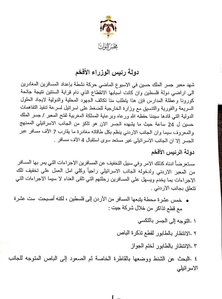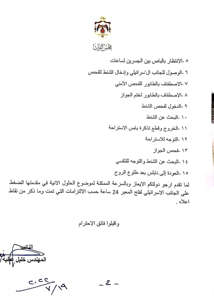 مستعرضاً ادناه كذلك الامر وفي سبيل التخفيف عن المسافرين الاجراءات التي يمر بها المسافر من المعبر الاردني ولدخوله الجانب الاسرائيلي راجياً وكلي امل العمل على تخفيف تلك الاجراءات بما يخدم ويسهل على المسافرين رحلتهم التي تلقى العناء لا سيما الاجراءات التي تتعلق بجانب الاردني .