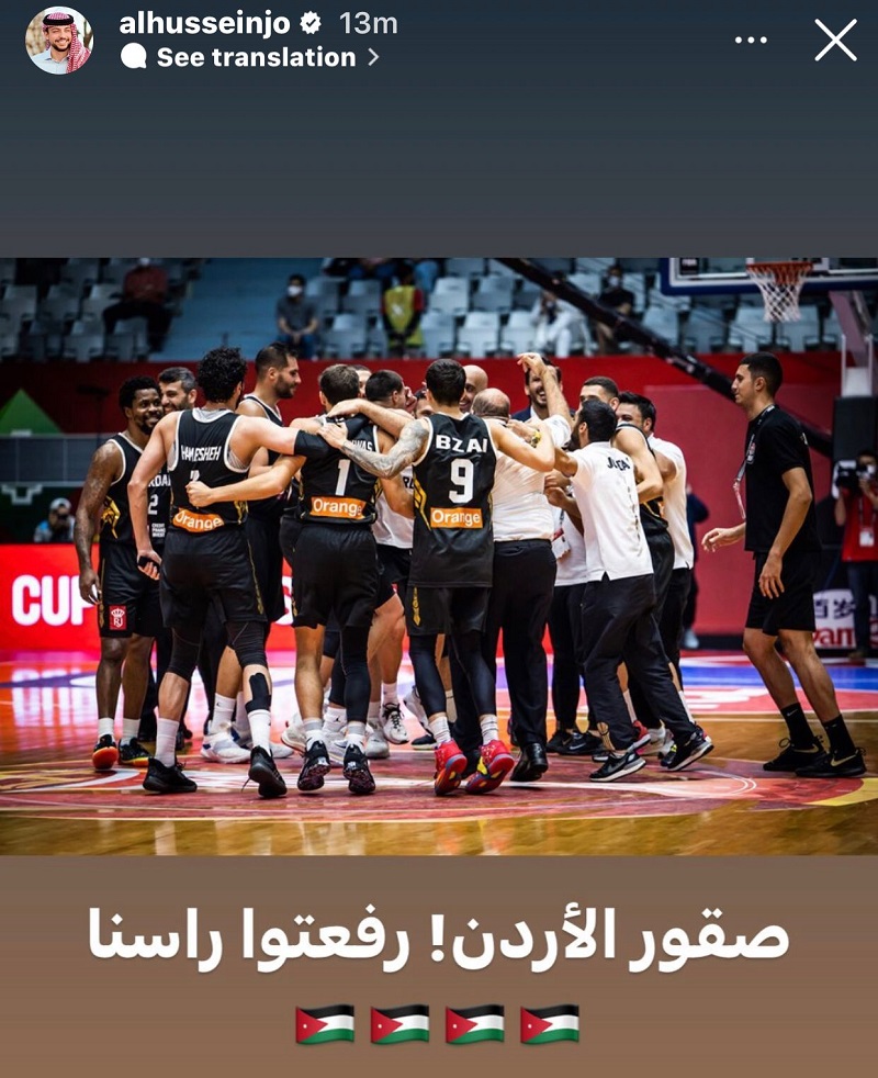 هنأ الأمير الحسين بن عبدالله الثاني، ولي العهد،المنتخب الاردني لكرة السلة بمناسبة تأهله لنصف نهائي كأس آسيا لكرة السلة بعد فوزه على ايران بنتيجة 91 – 76.