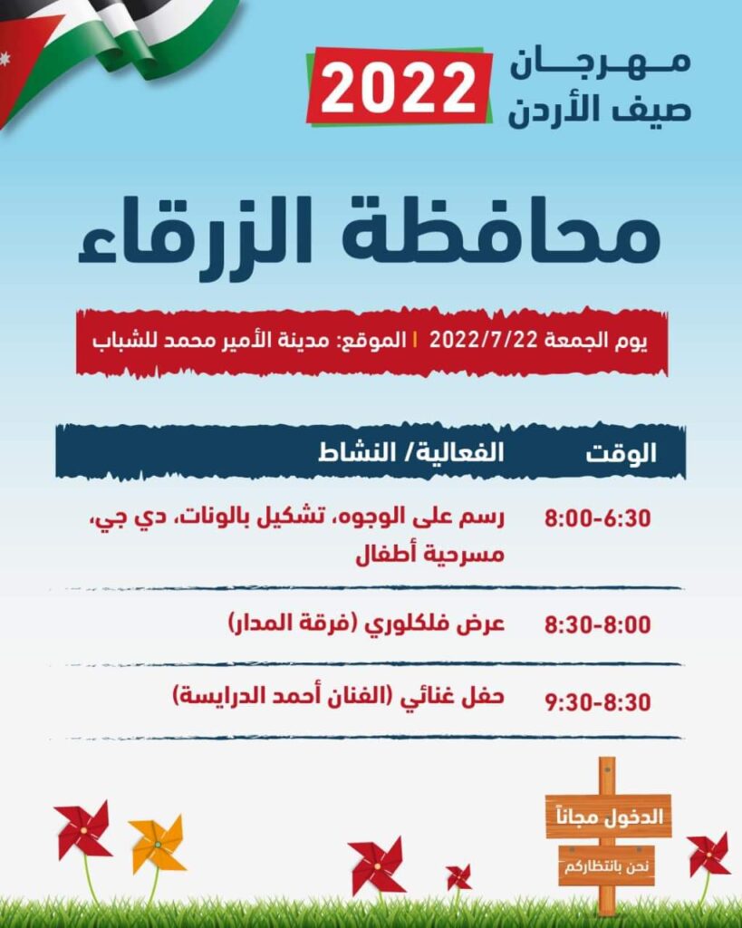 تتواصل ا ليوم الجمعة، فعاليَّات #مهرجان صيف الأردن_2022 في محافظة الزرقاء والتي تتضمن عروضاً مسرحيَّة وفلكلوريَّة وفنيَّة، وفعاليَّات ترفيهيَّة للأطفال، بالإضافة إلى حفلة غنائيَّة يقدِّمها الفنان احمد الدرايسة