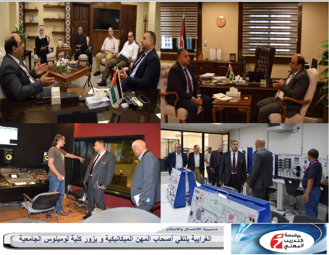 التقى المهندس أحمد الغرايبه مدير عام مؤسسة التدريب المهني في مكتبه، المهندس جميل أبو رحمة نقيب أصحاب المهن الميكانيكية لبحث وتعزيز مجالات التعاون في مجال التدريب المهني/ صيانة السيارات الهجينة والكهربائية والتطوير عليها، و تطوير وتحديث البرامج التدريبية وعقدها ورفع كفاءة المدربين وتأمين التدريب الميداني للمتدربين في معاهد المؤسّسة.