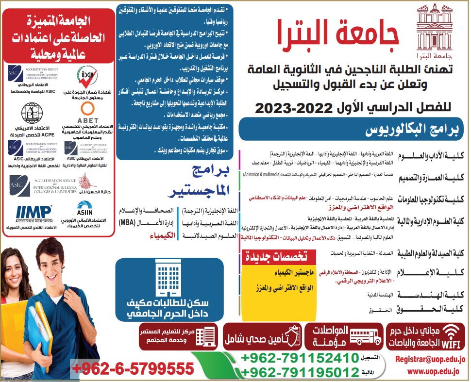 الرئيسية/تعليم وجامعات/جامعة البترا تهنئ الطلبة الناجحين في الثانوية تعليم وجامعات جامعة البترا تهنئ الطلبة الناجحين في الثانوية 18 أغسطس، 2022آخر تحديث: 18 أغسطس، 2022 أقل من دقيقة فيسبوك X بينتيريست ماسنجر ماسنجر واتساب هرمنا الاخباري – عمان 18 أغسطس، 2022آخر تحديث: 18 أغسطس، 2022 أقل من دقيقة فيسبوك X بينتيريست ماسنجر ماسنجر واتساب شاركها فيسبوك X بينتيريست ماسنجر ماسنجر واتساب