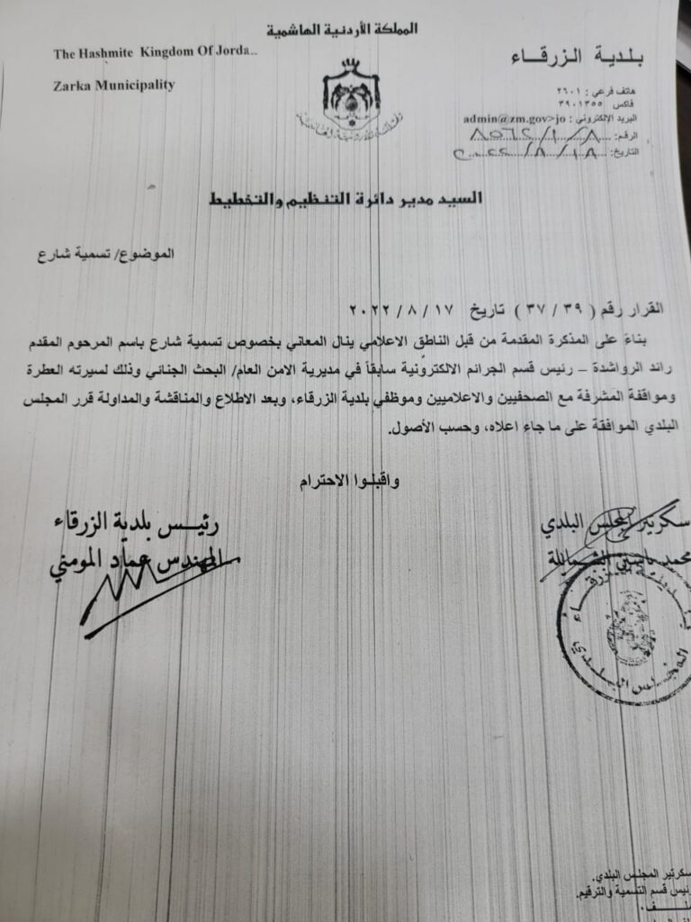 قرر مجلس بلدي الزرقاء تسمية شارع باسم المرحوم المقدم رائد الرواشدة رئيس قسم الجرائم الالكترونية الاسبق في ادارة البحث الجنائي بمديرية الامن العام.