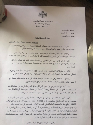 وجه أهالي لواء الحسا برقية ومذكرة عاجلة لمحافظ الطفيلة يطالبونه من خلالها بضرورة التدخل السريع وإنقاذ مدرسة وروضة براعم الفوسفات من الإجراءات الأخيرة المتخذة بحقها من قبل رئيس مجلس إدارة شركة مناجم الفوسفات محمد الذنيبات .