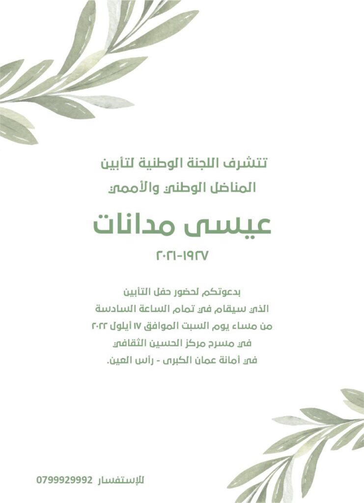 تتشرف اللجنة الوطنية بدعوتكم لحضور حفل تابين المناضل الوطني والاممي عيسى مدانات يوم السبت الموافق 17 / ايلول 2022 الساعة الساعة 6 مساءا في قاعة مركز الثقافة الملكي في أمانة عمان الكبرى _ راس العين