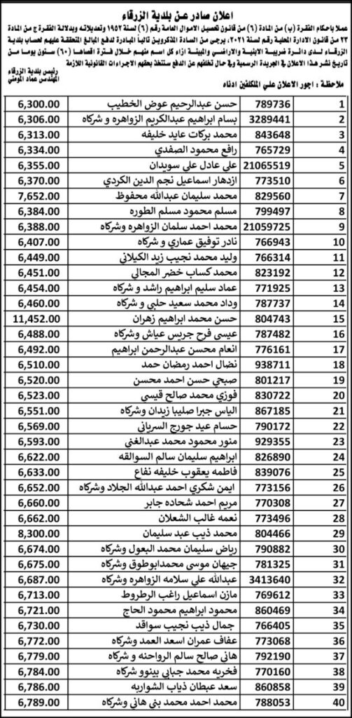 نشرت بلدية الزرقاء الدفعة السادسة من اسماء الأشخاص المتخلفين عن دفع الضرائب المترتبة عليهم لصالح البلدية.