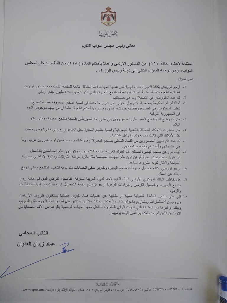 وجه النائب المحامي عماد العدوان سؤالا نيابيا لرئيس الوزراء حول تفاصيل قضية فساد متعلقة بمنتجع البحيرة والتي تقدر ب45مليون دينار، ذهب ضحيتها مساهمين أردنيين وعرب.