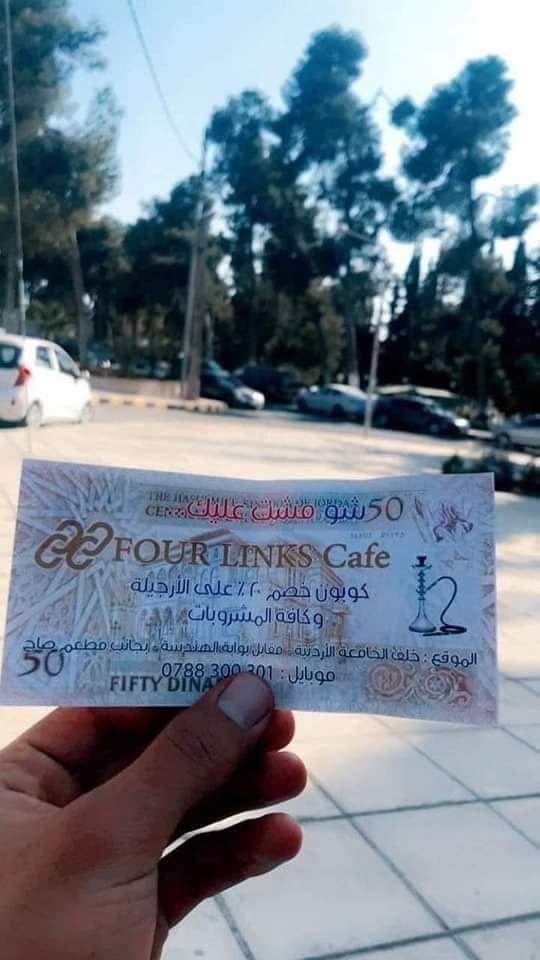 تداول رواد مواقع التواصل الإجتماعي صورا ومقاطع فيديو لصاحب مقهى في عمان استخدم صورا لأوراق نقدية من فئة الخمسين دينارا لغايات الدعاية .مصدر أمني قال أنه تم القبض على هذا الشخص ، مشيرا الى أن معلومات وردت عن قيام مالك أحد المقاهي في العاصمة باستخدام صور لأوراق نقدية من فئة الخمسين ديناراً من أجل الدعاية للمقهى وإعطاء خصومات لزبائنه .وأكّد المصدر أنه جرى ضبط ذلك الشخص وكافة الاوراق المصورة لديه وستتم إحالته للقضاء.