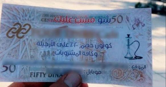 قام مالك أحد المقاهي في العاصمة باستخدام صور لأوراق نقدية من فئة الخمسين ديناراً من أجل الدعاية للمقهى وإعطاء خصومات لزبائنه .
