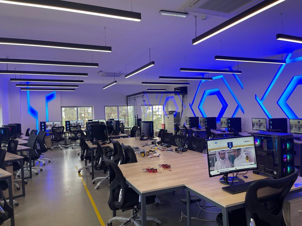 حيث تم تجهيز مختبر الذكاء الاصطناعي بمجموعة متكاملة من أنظمة الروبوت مثل الإنسان الآلي الاجتماعي (Pepper)، اذرع روبوتية ((Robotic Arms ، أيدي الروبوت (Robot hands) ،أنظمة القيادة الالية والدفع الرباعي ، أنظمة الاستشعار عن بعد ، شاشات تفاعلية ذكية للمختبرات ، حواسيب خاصة للطلبة بمواصفات عالية .