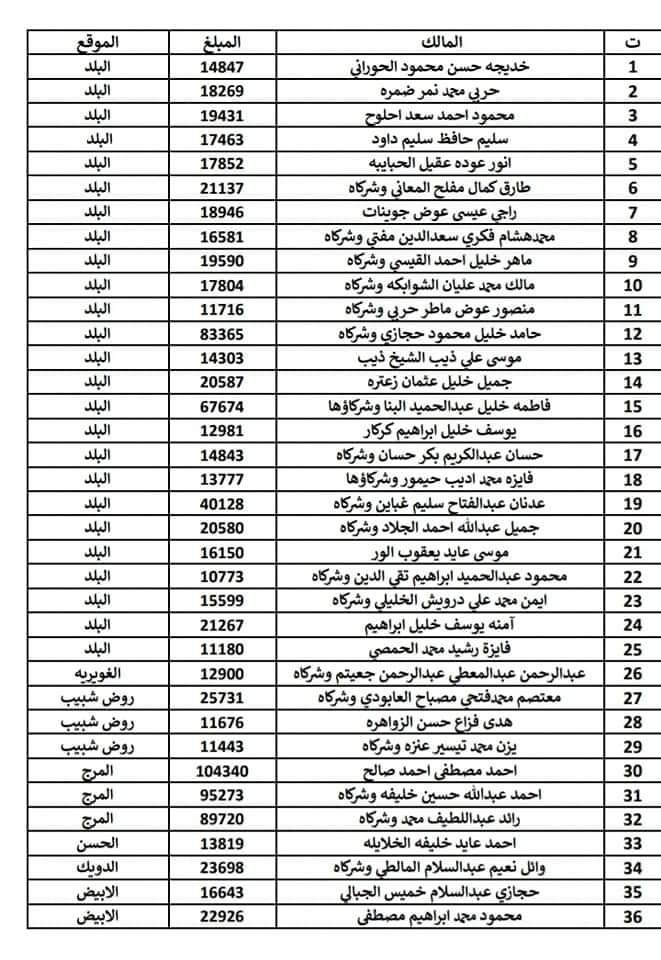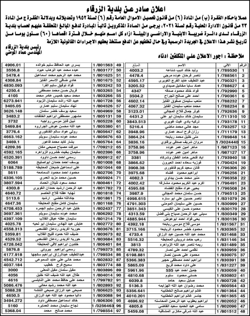 نشرت بلدية الزرقاء دفعة جديدة من اسماء الأشخاص المتخلفين عن دفع الضرائب المترتبة عليهم لصالح البلدية. وتوعدت البلدية، باتخاذ الإجراءات المتبعة في قانون تحصيل الأموال العامة بعد 60 يوما من نشر اسماء المكلفين بالكشوفات في الصحف المحلية . ودعت البلدية المواطنين بضرورة مراجعة دائرة ضريبة الابنية والاراضي (المسقفات) لدفع ما يترتب عليهم من ضرائب. وتاليا الأسماء