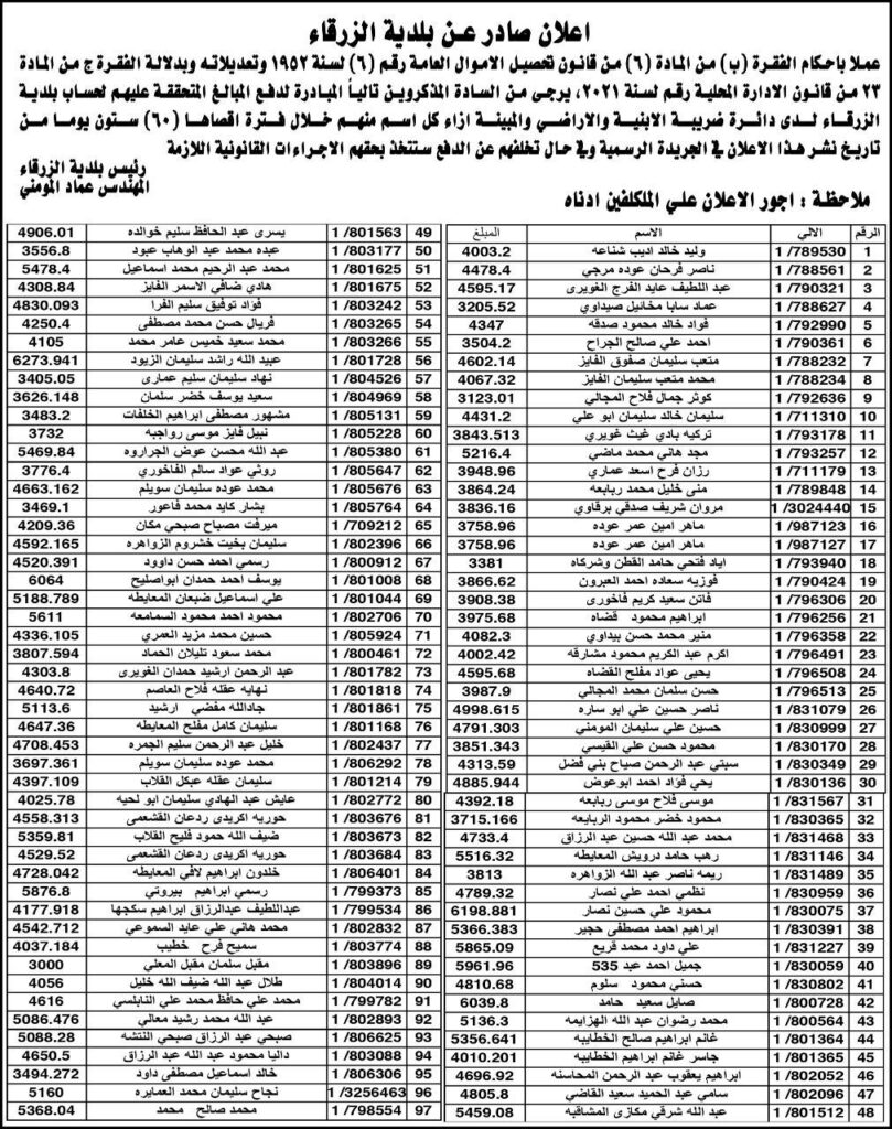 “بلدية الزرقاء” تنشر دفعة جديدة من أسماء المتخلفين عن دفع الضرائب
