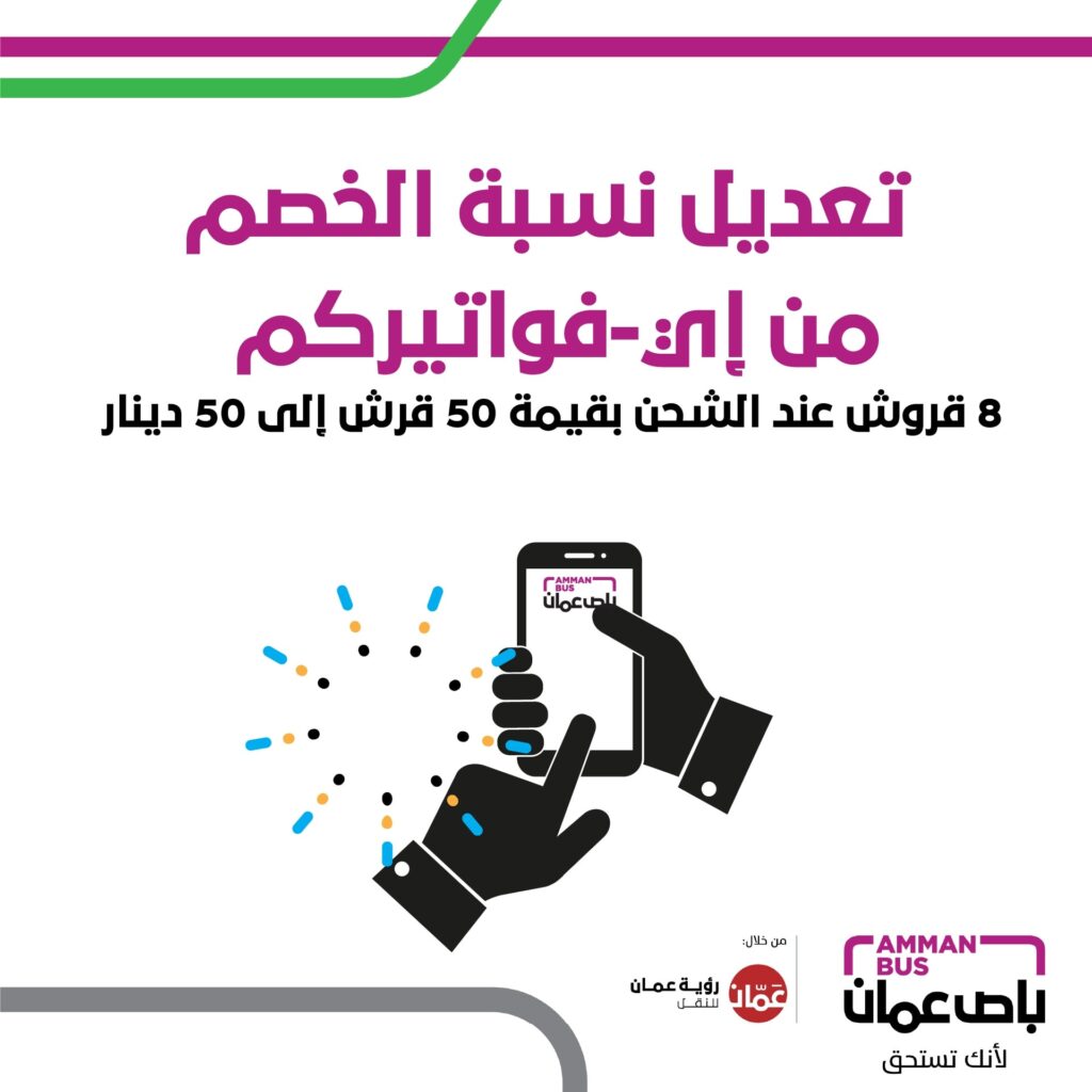 هرمنا – أعلنت الصفحة الرسمية المشغلة لباص عمان عبر فيسبوك، تعديل نسبة الخصم عند شحن بطاقات باص عمان والباص السريع إلكترونيًا عبر (إي فواتيركم).