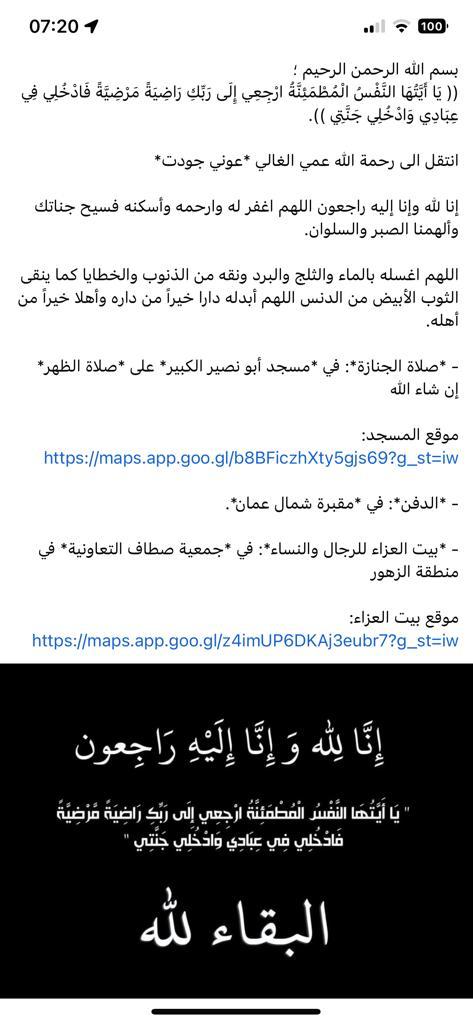 صلاة الجنازة في مسجد ابو نصير الكبير على صلاة الظهر والدفن في مقبرة شمال شمال عمان بيت العزاء للرجال والنساء في جمعية صطاف التعاونية في منطقة الزهور