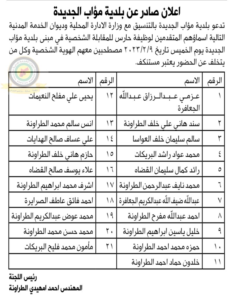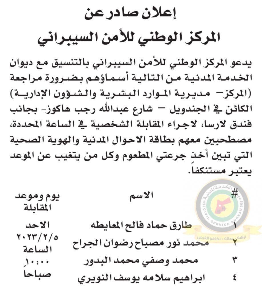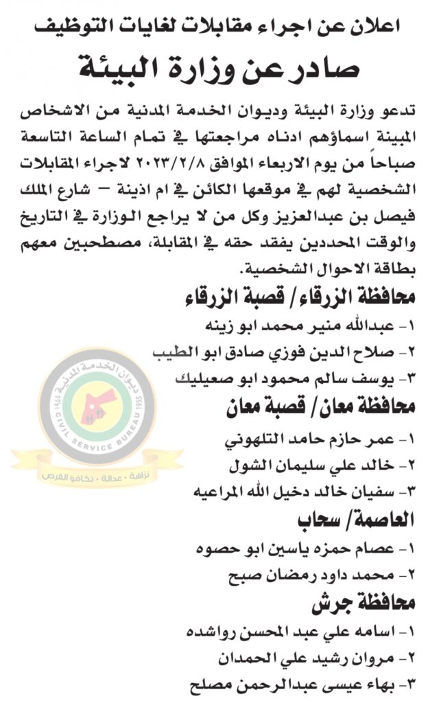 ديوان الخدمة المدنية بالتعاون مع مختلف الوزارات والمؤسسات الحكومية، التالية اسماؤهم لاجراء المقابلات الشخصية وعقد الامتحان التنافسي لغايات التعيين.