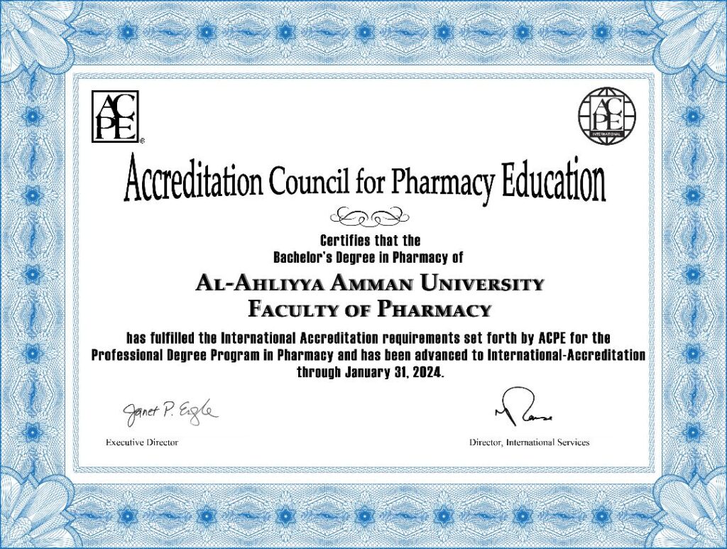 حصلت كلية الصيدلة في جامعة عمان الاهلية على شهادة الاعتمادية الدولية الأمريكية American council for pharmacy education والتي تعرف اختصارا بـ ACPE.