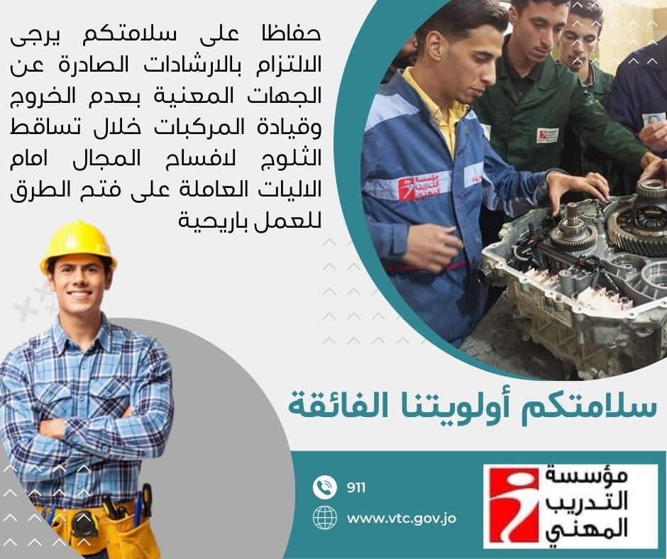 مؤسسة التدريب المهني قالت للمواطنين حفاظا على سلامتكم يرجى الالتزام بالإرشادات الصادرة عن الجهات المعنية بعدم الخروج وقبادة المركبات خلال تساقط الثلوج لافساح المجال أمام الأليات العاملة على فتح الطرق للعمل بأريحية