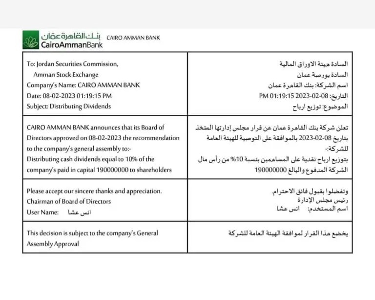أعلن بنك القاهرة عمان عبر إفصاح نشر على موقع هيئة الأوراق الماليةـ عن قرار مجلس إدارتها المتخذ بتاريخ 08-02-2023 بالموافقة على التوصية للهيئة العامة للشركة بتوزيع أرباح نقدية على المساهمين بنسبة 10% من رأس مال الشركة المدفوع والبالغ 190000000.