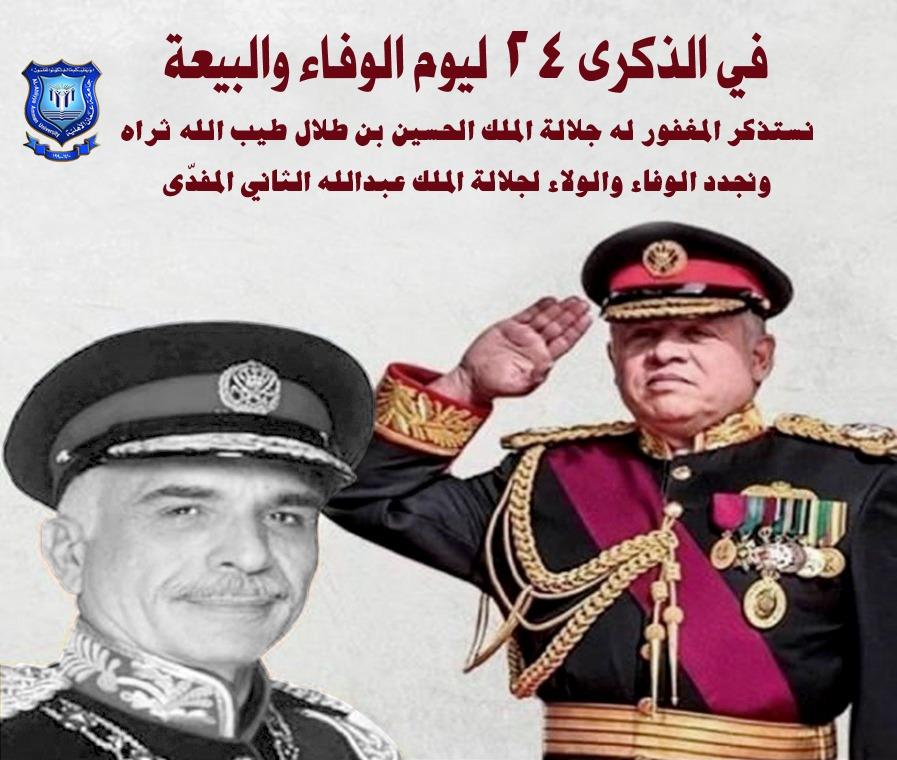 في الذكرى الرابعة والعشرين ليوم الوفاء والبيعة، أسرة جامعة عمان الاهلية ممثلة برئيس وأعضاء مجلس الأمناء ورئيس وأعضاء هيئة المديرين ورئيس الجامعة وأعضاء الهيئتين التدريسية والإدارية وطلبة الجامعة يستذكرون المغفور له بإذن الله جلالة الملك الحسين بن طلال طيب الله ثراه، ويجددون الوفاء والولاء لقائد الوطن جلالة الملك عبدالله الثاني المفدّى