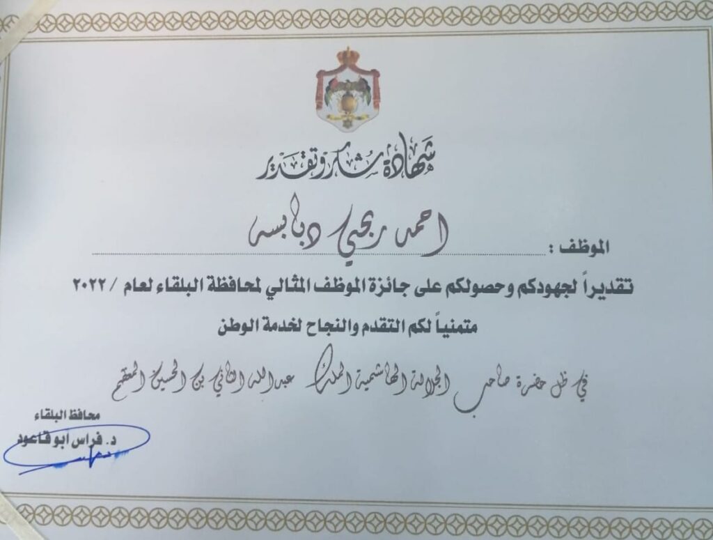 بمناسبة فوزهم بجائزة الموظف المثالي على مستوى محافظة البلقاء للعام 2022