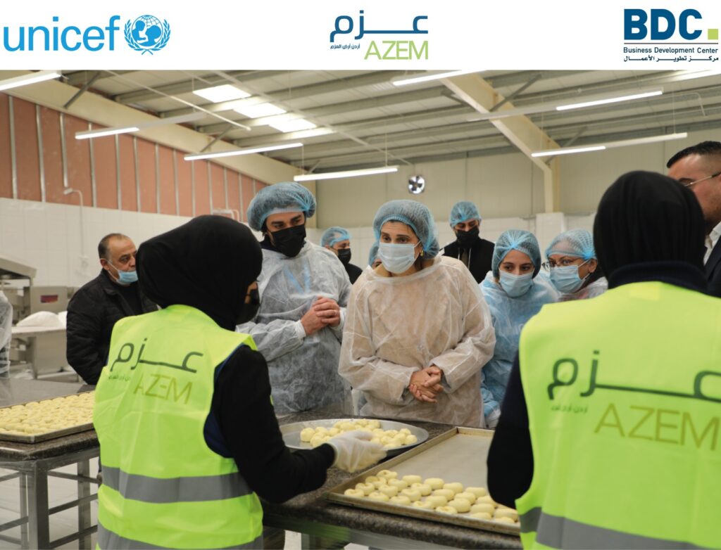اطلعت سمو الاميرة دينا مرعد على نتائج مشروع عزم “التدريب المهني للتشغيل” من خلال زيارة ميدانية برفقة الجهة الداعمة منظمة الامم المتحدة للطفولة – Unicef ومركز تطوير الاعمال – BDC كجهة تنفيذية داخل مصنع العنتباوي في منطقة عين الباشا.