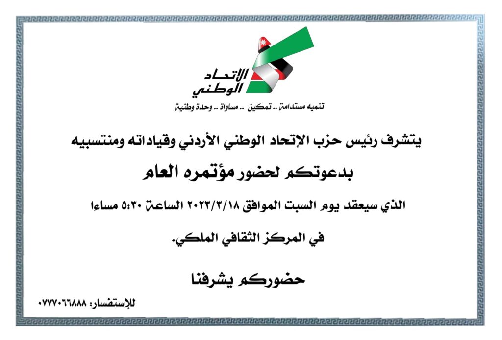 يتشرف حزب الاتحاد الوطني الاردني وقيادتة ومنتسبة بدعوتكم لحضور الموتمر العام في المركز الثقافي وذلك يوم السبت