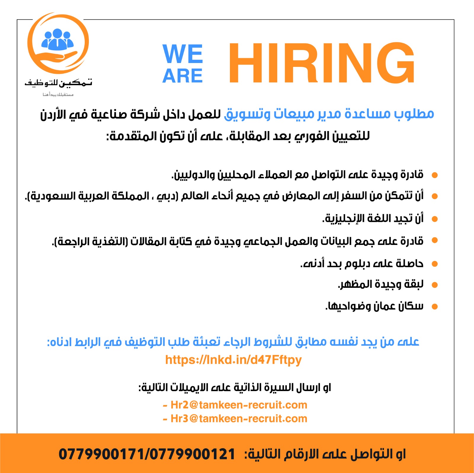 مطلوب مساعدة مدير مبيعات وتسويق للعمل داخل شركة صناعية في الأردن للتعيين الفوري بعد المقابلة، على أن تكون المتقدمة: