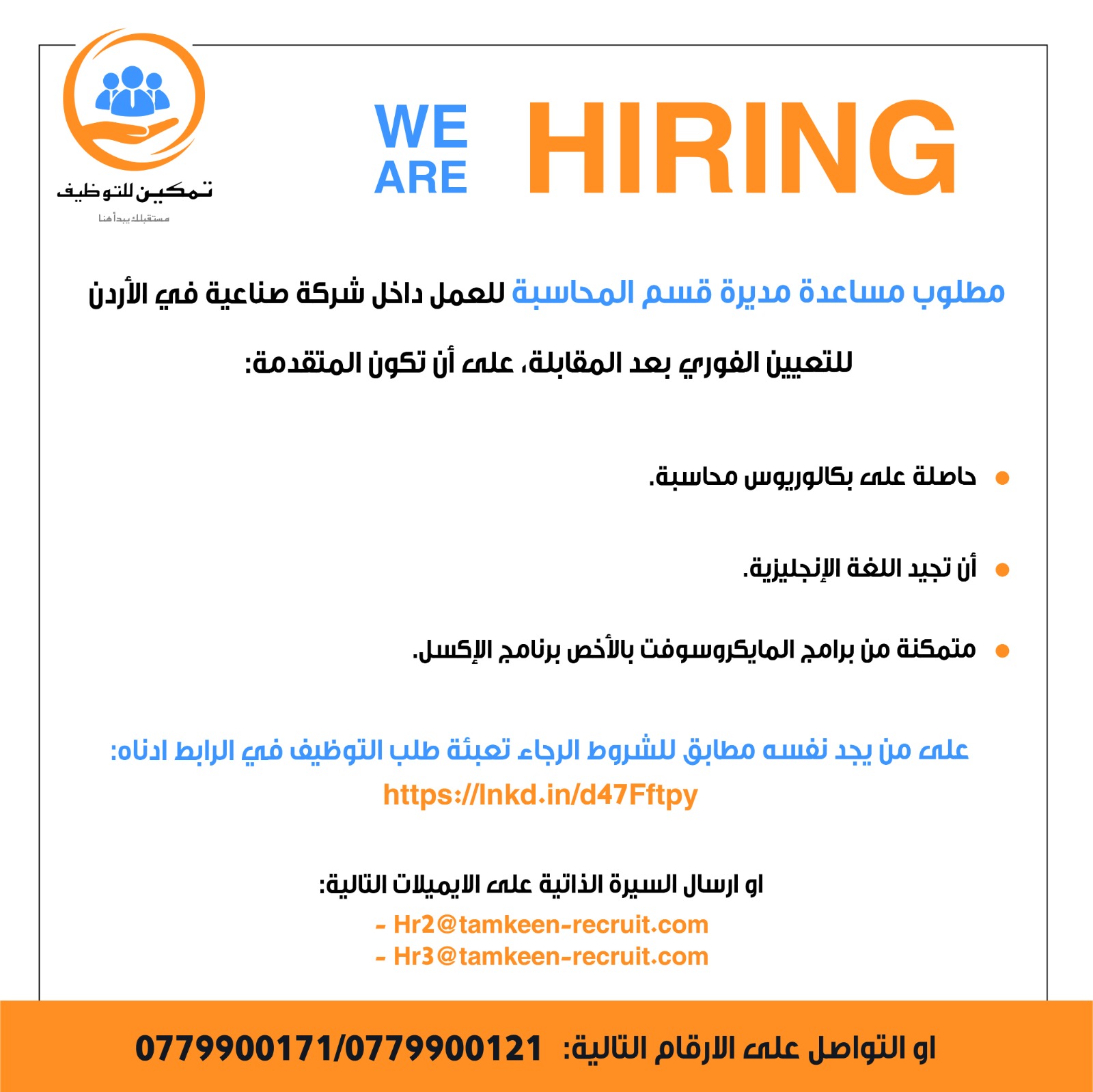 مطلوب مساعدة مديرة قسم المحاسبة للعمل داخل شركة صناعية في الأردن للتعيين الفوري بعد المقابلة، على أن تكون المتقدمة: