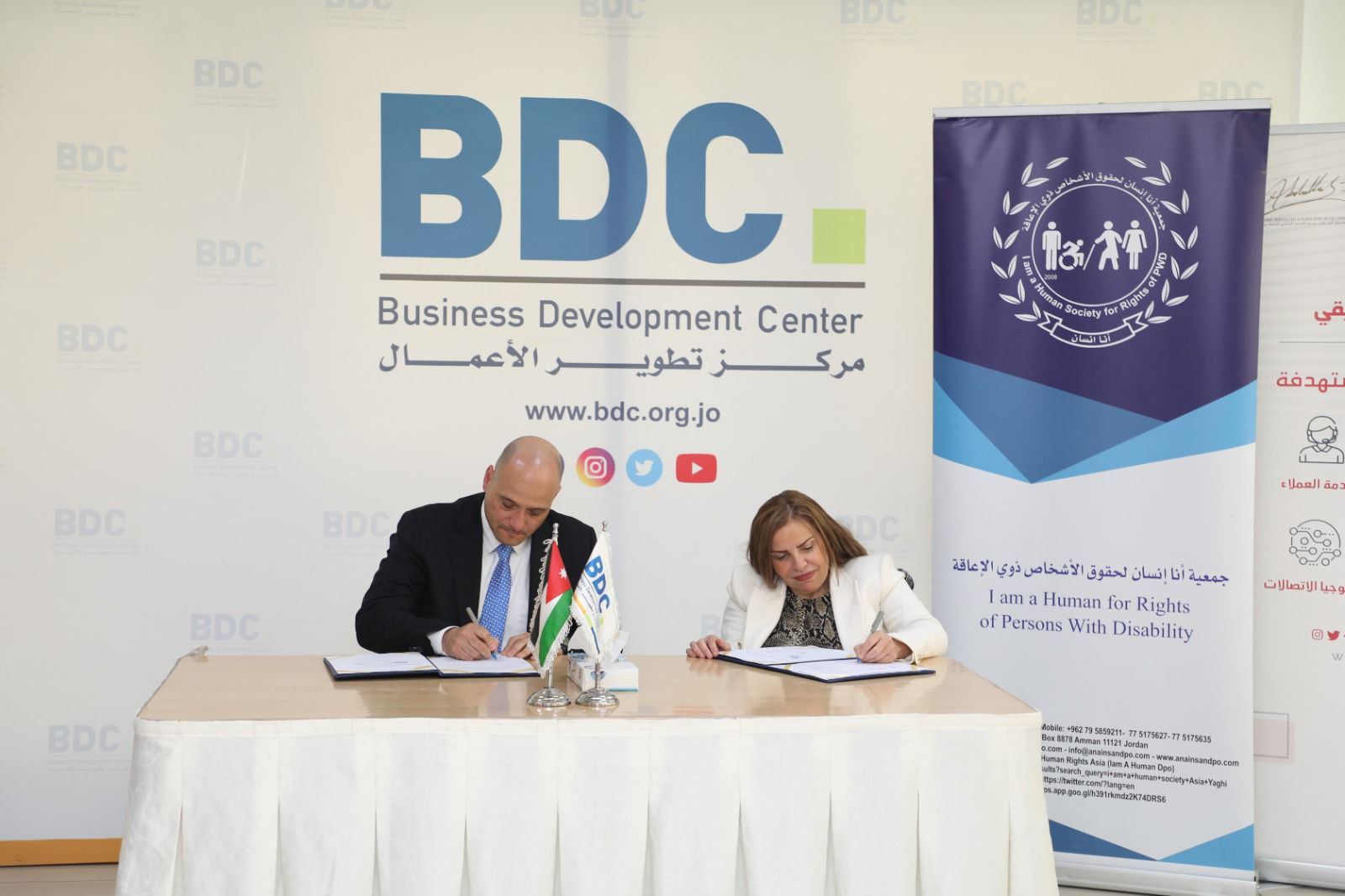 وقع مركز تطوير الأعمال – BDC وجمعية أنا إنسان لحقوق الأشخاص ذوي الإعاقة مذكرة تفاهم بهدف إنشاء شبكة وقاعدة بيانات مشتركة بين الفريقين للتعاون في مجال إدماج ورفد سوق العمل بكوادر مؤهلة من ذوي الإعاقة لغايات التشغيل والتشغيل الذاتي.