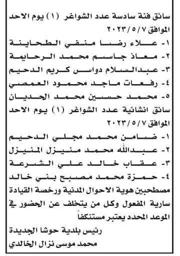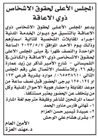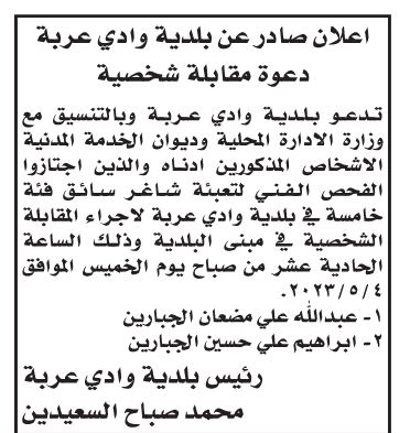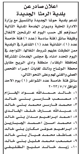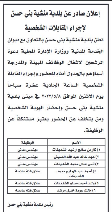 دعت بلديات ومؤسسات حكومية بالتنسيق مع وزارة الإدارة المحلية وديوان الخدمة المدنية، اليوم الثلاثاء عدد من المرشحين لإجراء المقابلات الشخصية.