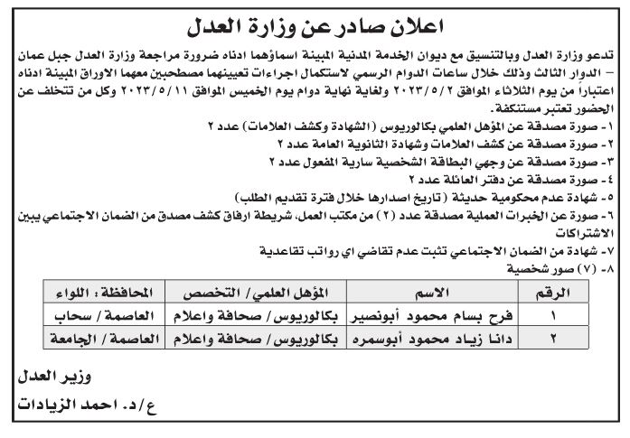 كما دعت وزارة العدل مرشحين لاستكمال إجراءات التعيين.
