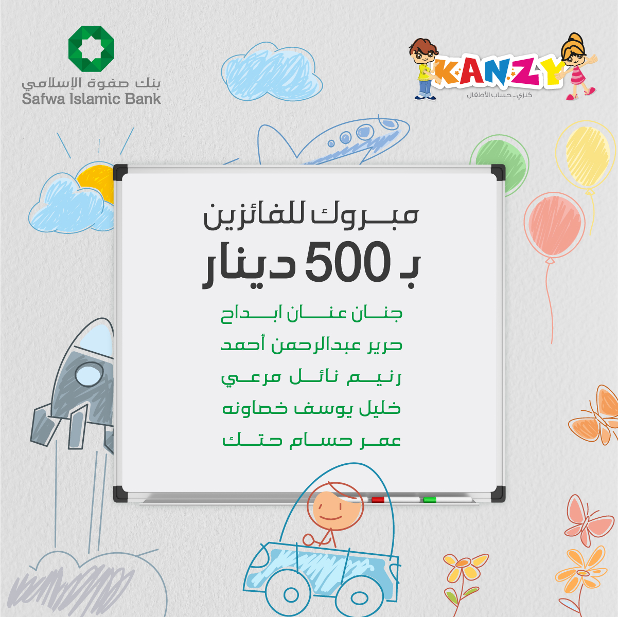 أضاف بنك صفوة الإسلامي مبلغاً إجمالياً بقيمة 2500 دينار أردني لرصيد خمسة فائزين من مدخريه الصغار في حساب توفير الأطفال “كنزي”، بموجب سحب شهر نيسان 2023 على جوائز الحساب، وذلك بواقع 500 دينار لكل منهم.