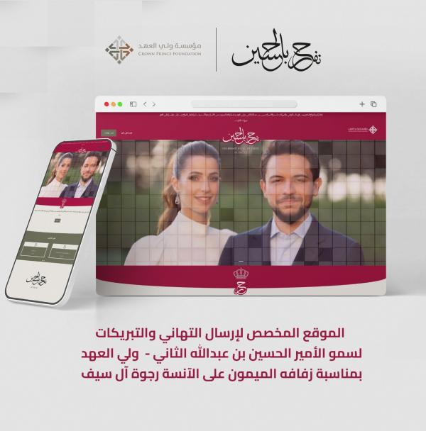 هرمنا الاخباري – أطلقت مؤسسة ولي العهد، منصة إلكترونية مخصصة لإرسال التهاني والتبريكات إلى سمو الأمير الحسين بن عبدالله الثاني، ولي العهد، والآنسة رجوة آل سيف بمناسبة الزفاف .