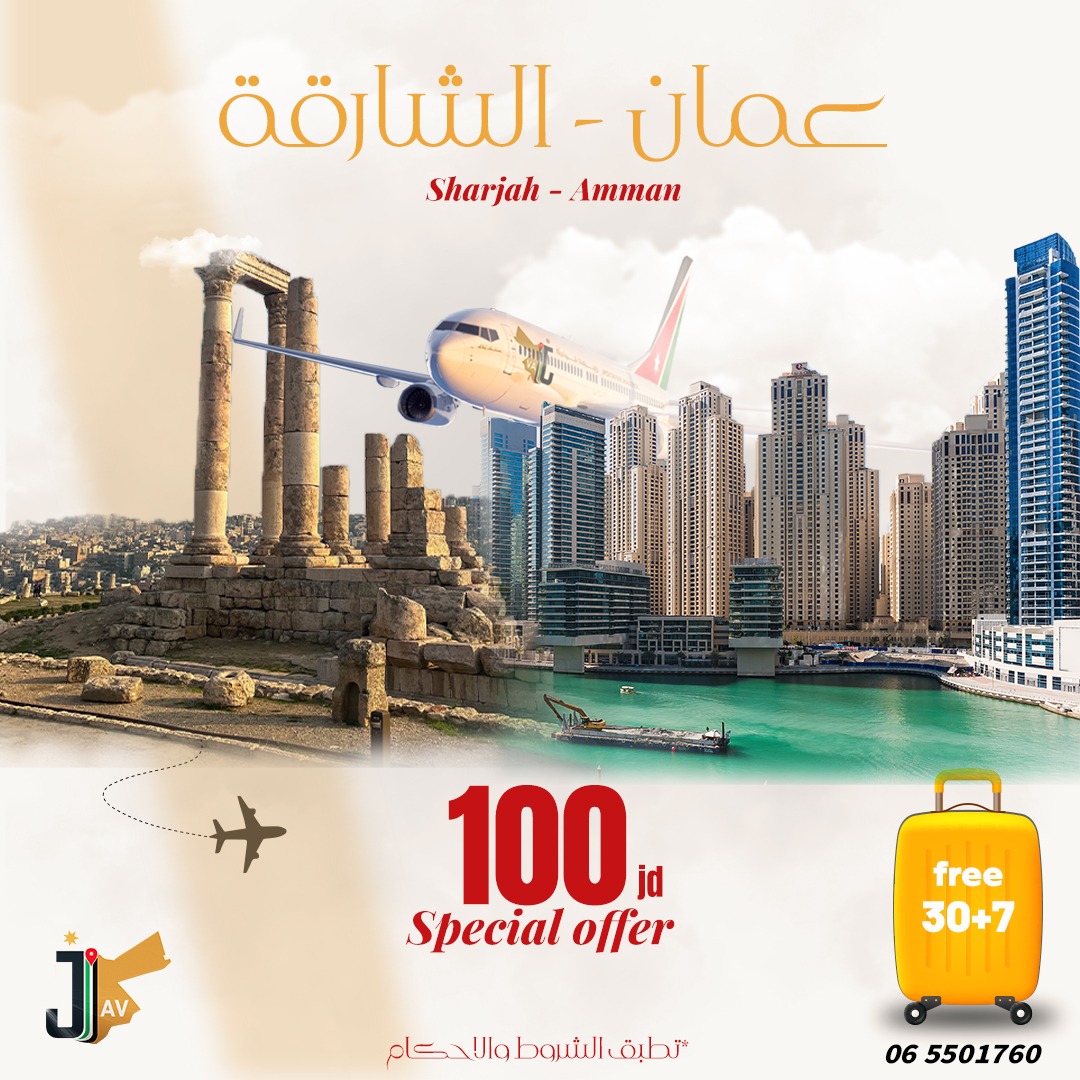 أعلنت الشركة الأردنية للطيران عن عرض خاص وحصري على رحلاتها من عمان الى الشارقة فقط ب 100 دينار شامل الضريبة بالإضافة الى وزن30 كيلو