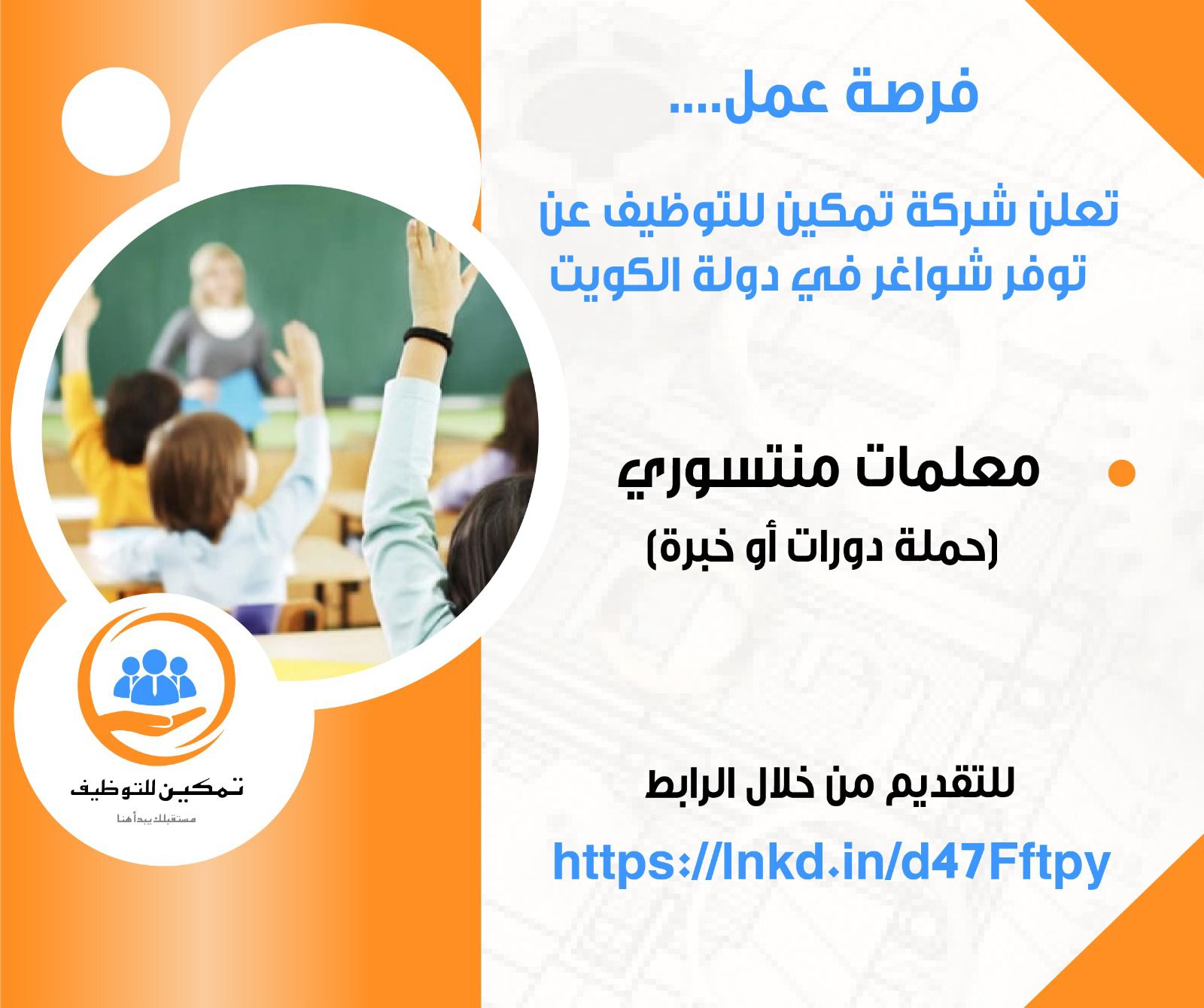 تعلن شركة تمكين للتوظيف عن توفر شواغر لمعلمات منتسوري (حملة دورات أو خبرة ) لاحدى العملاء في دولة الكويت.