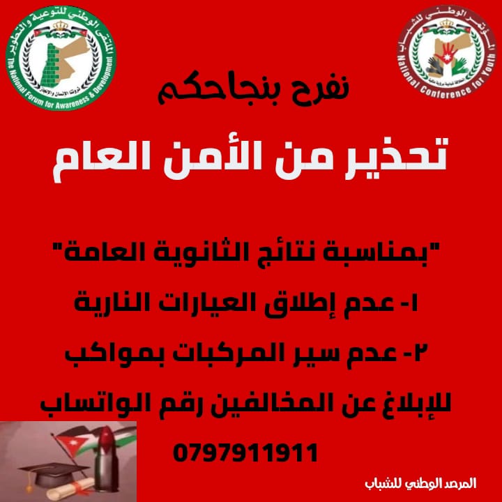 بمناسبة نتائج الثانوية العامة الملتقى الوطني للتوعية قال ” نفرح بننجاحكم : وحذر الامن العام بمناسبة نتائج الثانوية العامة وعدم اطلاق العيارات الناربة وعدم سير المركبات والابلاغ عن المخالفيين تحت رقم الواتس اب 0797911911