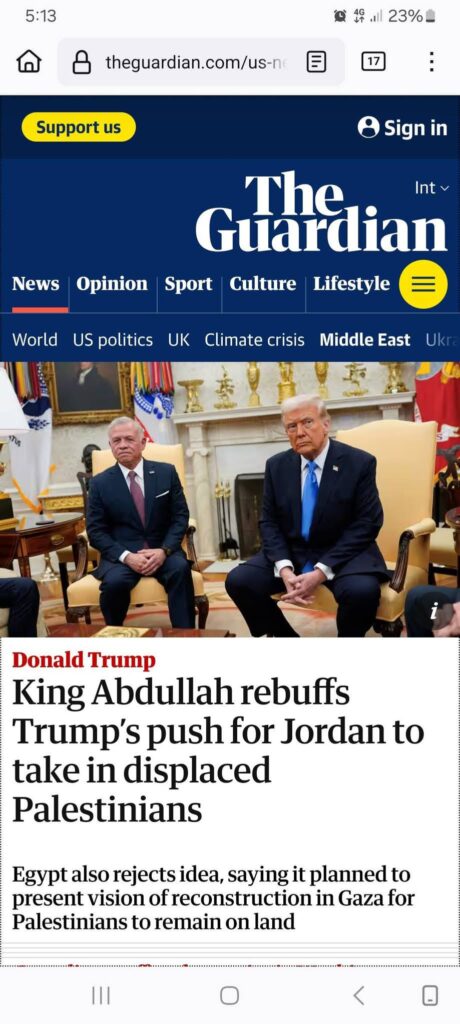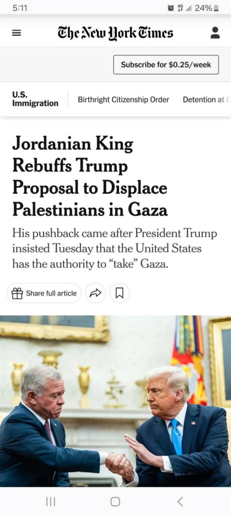 عنوان الخبر الرئيسي في صحيفه نيورك تايمز The New York Times ” العاهل الأردني يرفض مقترحات ترامب بتهجير الفلسطينين في غزه ” وفي صحيفه الجاردين The Guardian “الملك عبدالله يرفض دعوه ترامب للاردن لاستقبال النازحين الفلسطينين” يكفي للرد .. على الجميع