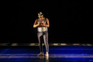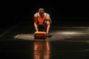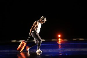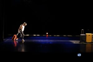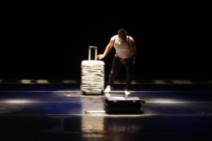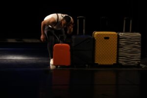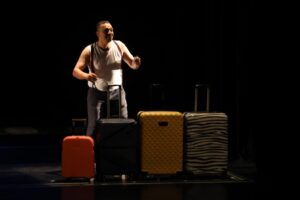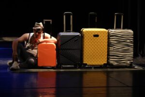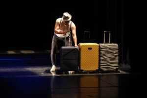 وفي إطار مونودرامي متماسك، يقف “الممثل – المسافر” ليحمل حقائبه المادية والرمزية، باحثًا عن إجابة لسؤال وجودي يتردد طيلة العرض: “إلى أين؟”. فالمسرحية لا تكتفي بعرض مشهد فردي عن الرحيل، بل تحوّله إلى سؤال جماعي يمسّ كل من اضطر أن يغادر، أن يهاجر، أن يُهجّر، أو أن يرحل مجبرًا من وطن بات غير قابل للسكن، بفعل الحروب والدمار والنكبات المتتالية، وحتى الإحتلال في العالم العربي.