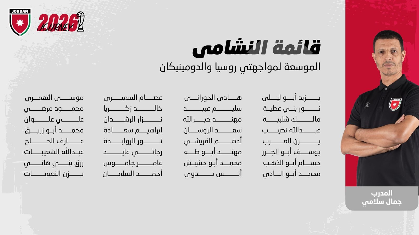 هرمنا-أعلن الجهاز الفني للمنتخب الوطني بقيادة المدرب المغربي جمال سلامي، قائمة أولية ضمت 32 لاعبا، استعدادا لمواجهتي روسيا والدومينيكان وديا، في إطار التحضيرات لخوض نهائيات كأس العالم 2026.